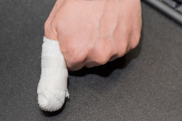 ら、指が木に当たり親先が裂けました。